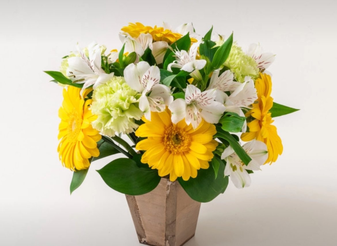 Arranjo de Gérberas e Astromélias Amarelas e Brancas
