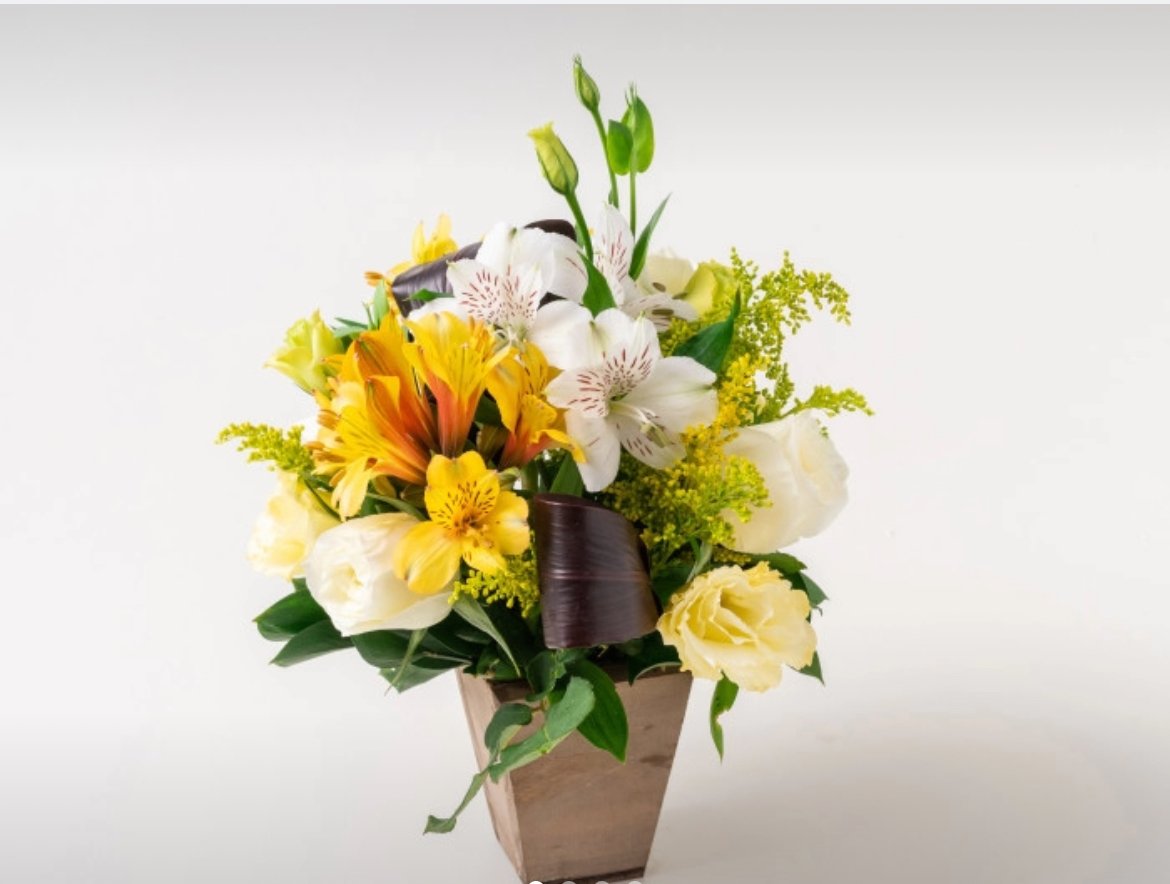 Arranjo de Gérberas e Astromélias Amarelas e Brancas