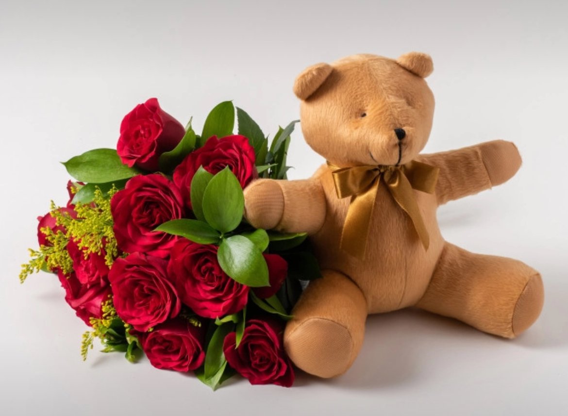 Buquê de 12 Rosas Vermelhas e Pelúcia