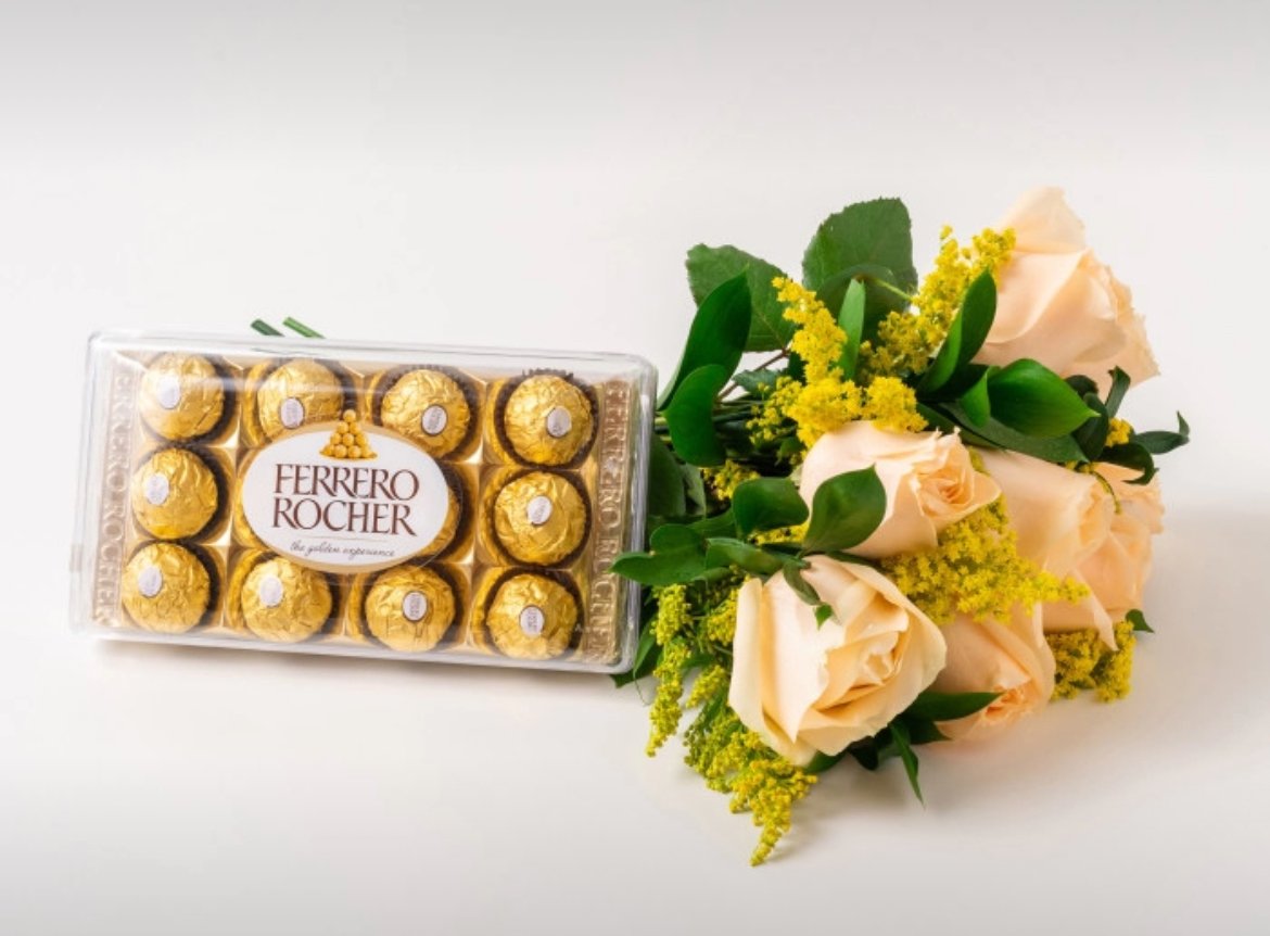 Buquê de 8 Rosas Champagne e Chocolate