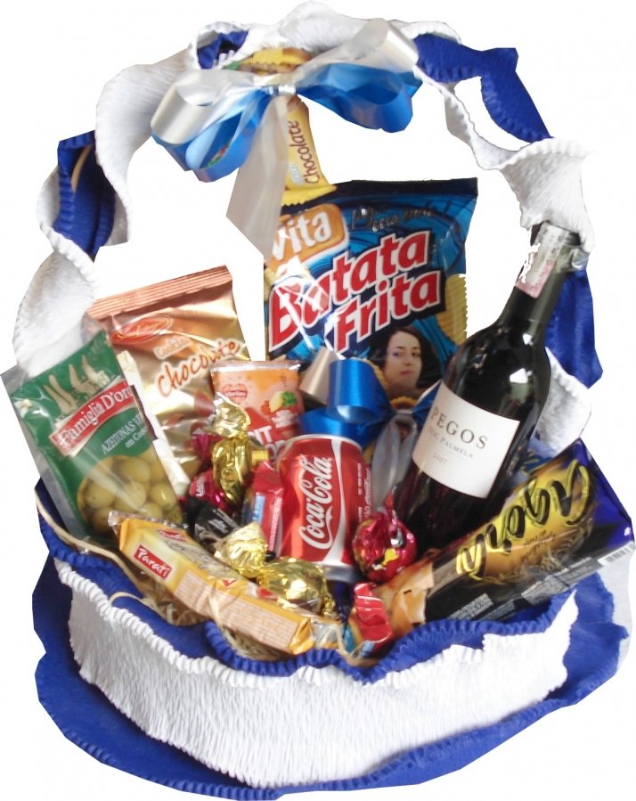LINDA E DELICADA CESTA DE BAMBU REDONDA, DECORADA C/ CREPON, LAÇOS E PAPEL CELOFANE, CONTENDO BOMBONS LACTA, 01 LATA COCA COLA, 01 CERVEJA LONG NECK STELLA ARTOIS, 01 TORRADA BAUDUCO, 01 BATATA CHIPS, 01 SACHE DE AZEITONA, 01 CLUB SOCIAL, SALGADINHO TORCIDA,01 BOLACHA CHOCOLATE, 01 VINHO, 01 CLUB SOCIAL RECHEADO.