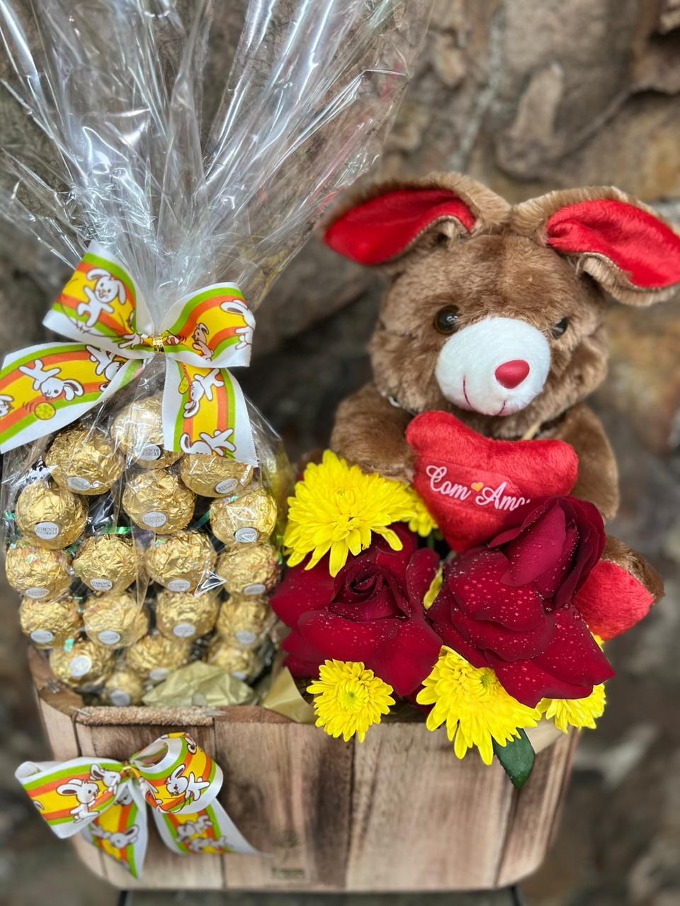 Cesta de páscoa com bandeja de Ferrero Rocher em formato de ovo, contendo 19 bombons, coelho de pelúcia, 2 rosas colombianas vermelhas com complemento em flores do campo (que podem variar a cor).